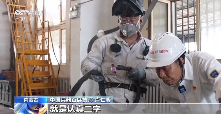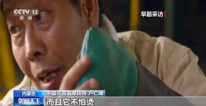 中国兵器首席技师卢仁峰:我这里为啥还要有这一个?用牙叼。实际上这个手就是辅助,帮我拿上来。当我焊开了以后,基本上我就拿牙咬着了。你看这个手套明显比别的厚,一般我卡住零件就用它,而且它不怕烫。